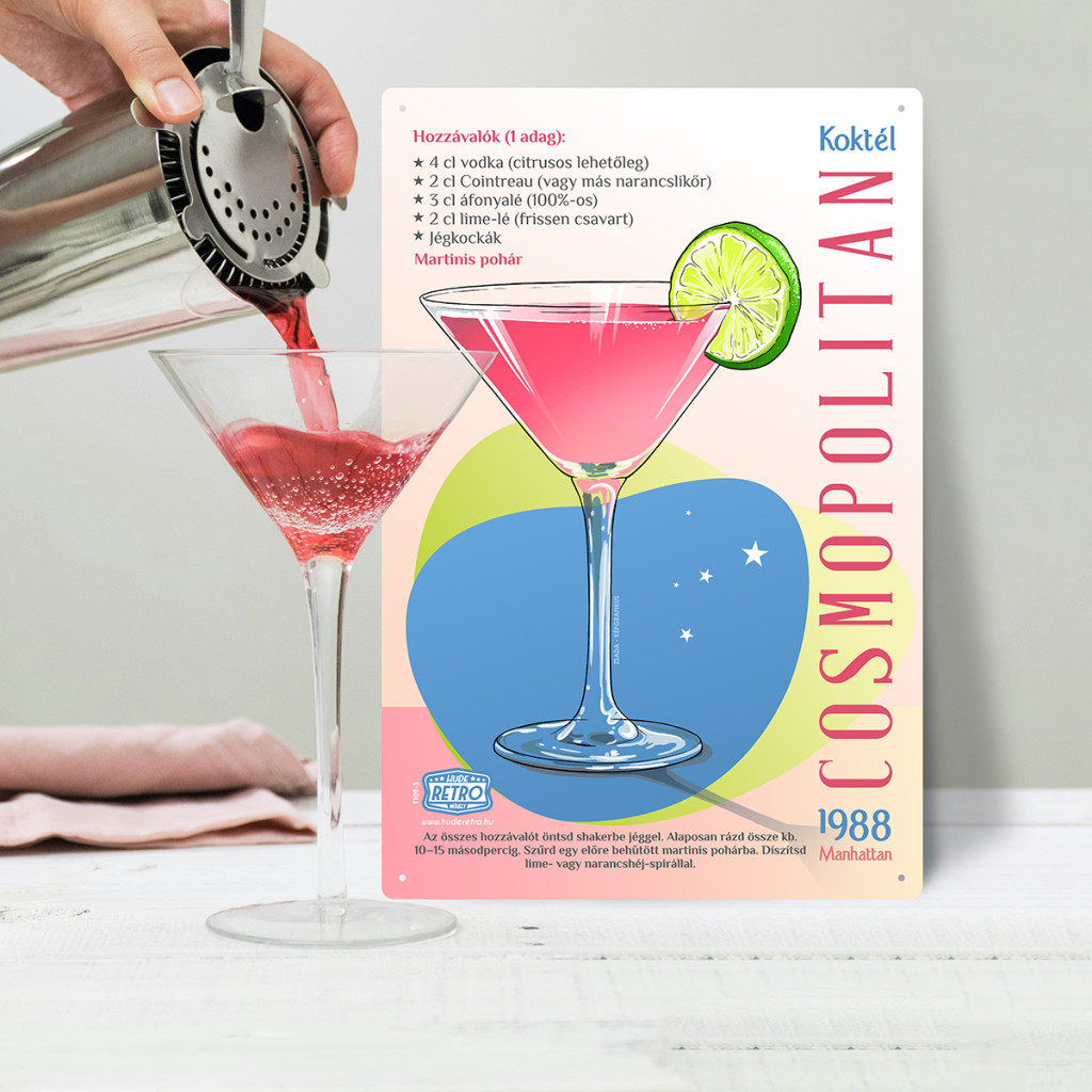 A táblán megtalálható a koktél pontos receptje, az összetevők aránya, valamint a származási helye – így nemcsak mutatós, de praktikus is.