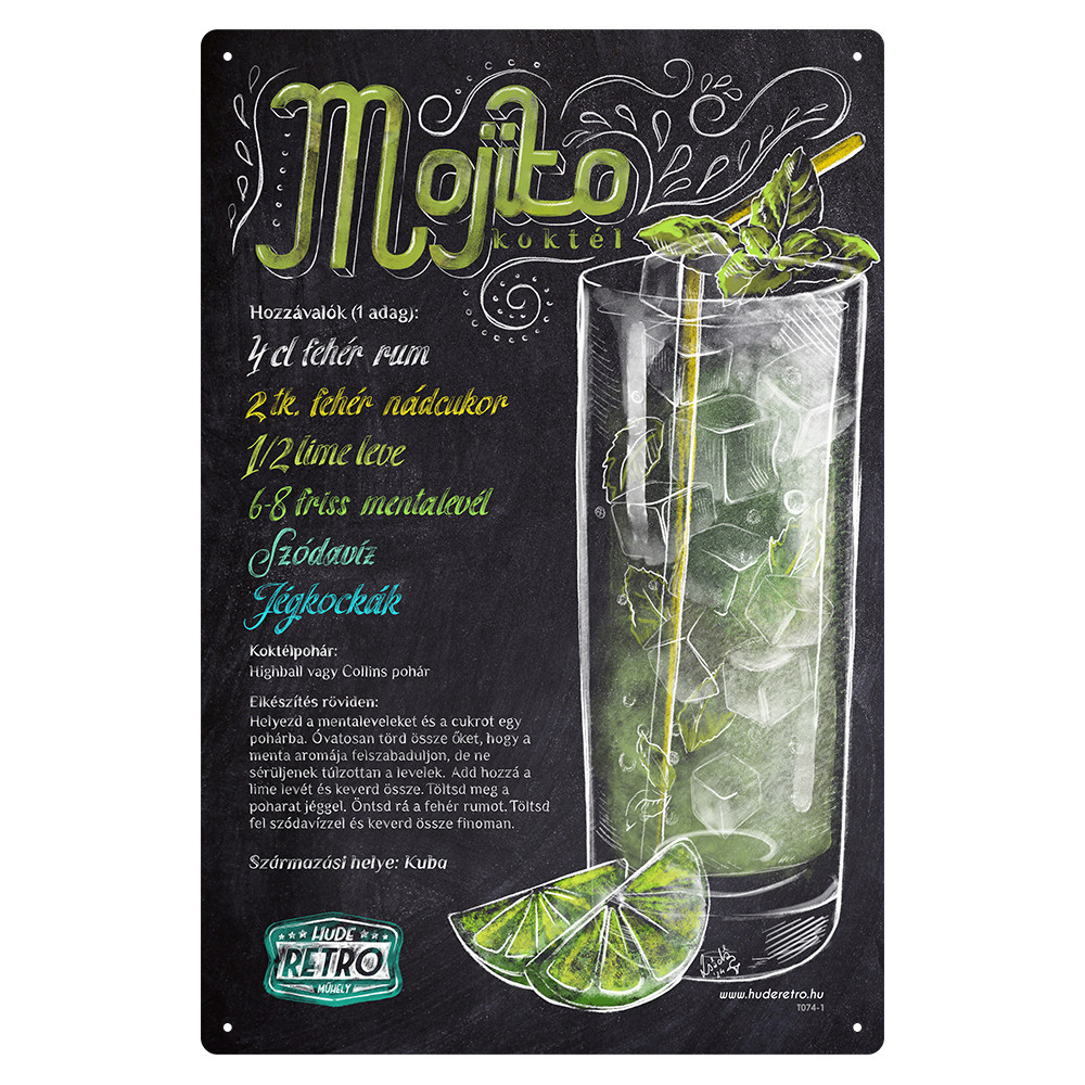 A táblán megtalálható a koktél pontos receptje, az összetevők aránya, valamint a származási helye – így nemcsak mutatós, de praktikus is.