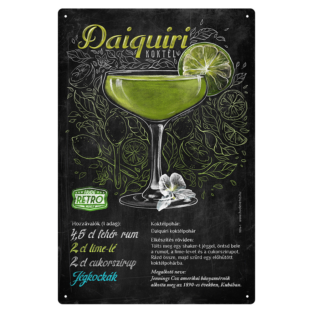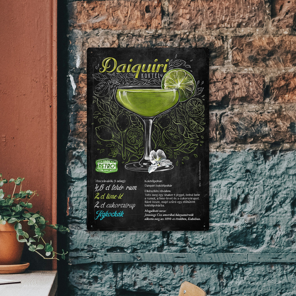 A táblán megtalálható a koktél pontos receptje, az összetevők aránya, valamint a származási helye – így nemcsak mutatós, de praktikus is.