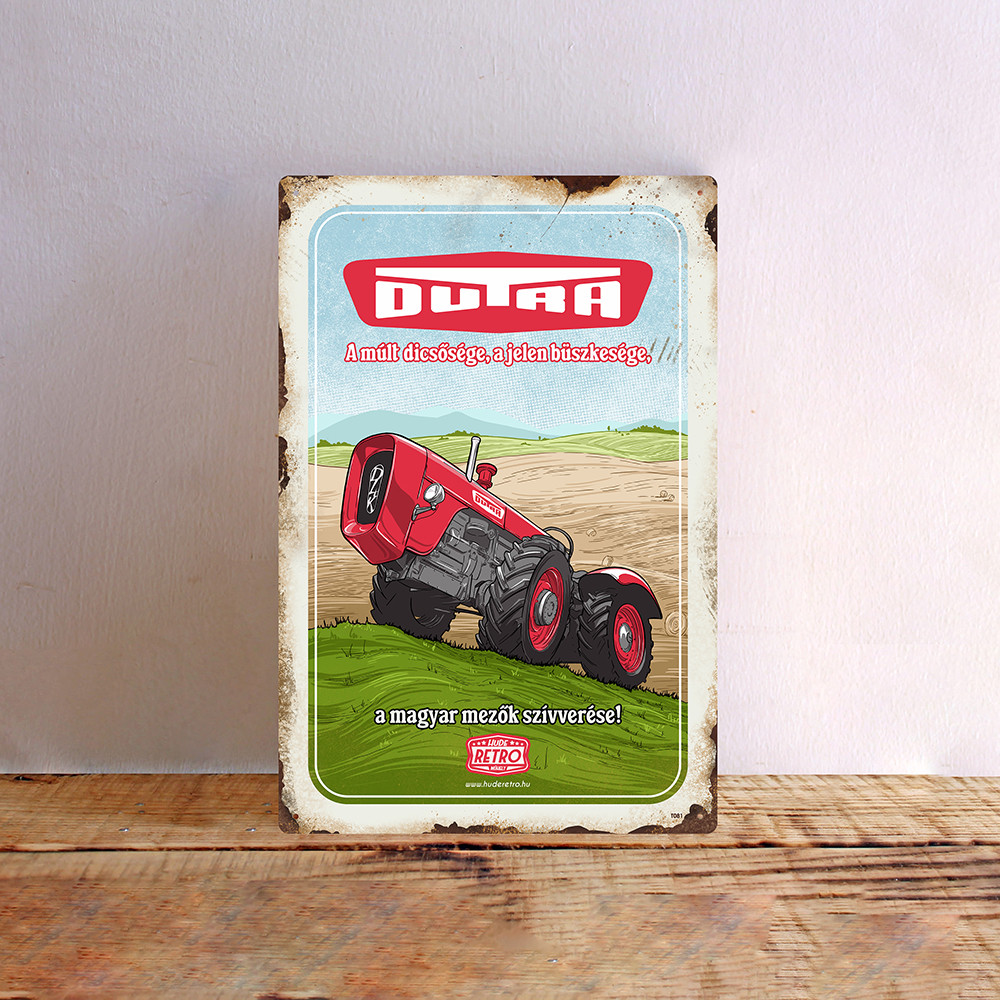 Ez a retró fémtábla azoknak szól, akik szívükben őrzik a mezőgazdaság régi nagy korszakát – különösen, ha a Dutra D4K nevét jól ismerik. A karakteres grafika és a büszke üzenet együtt emlékeztetnek arra az időre, amikor a magyar földeken a gépek nem csupán dolgoztak, hanem történelmet is írtam a magyar gépgyártásban.