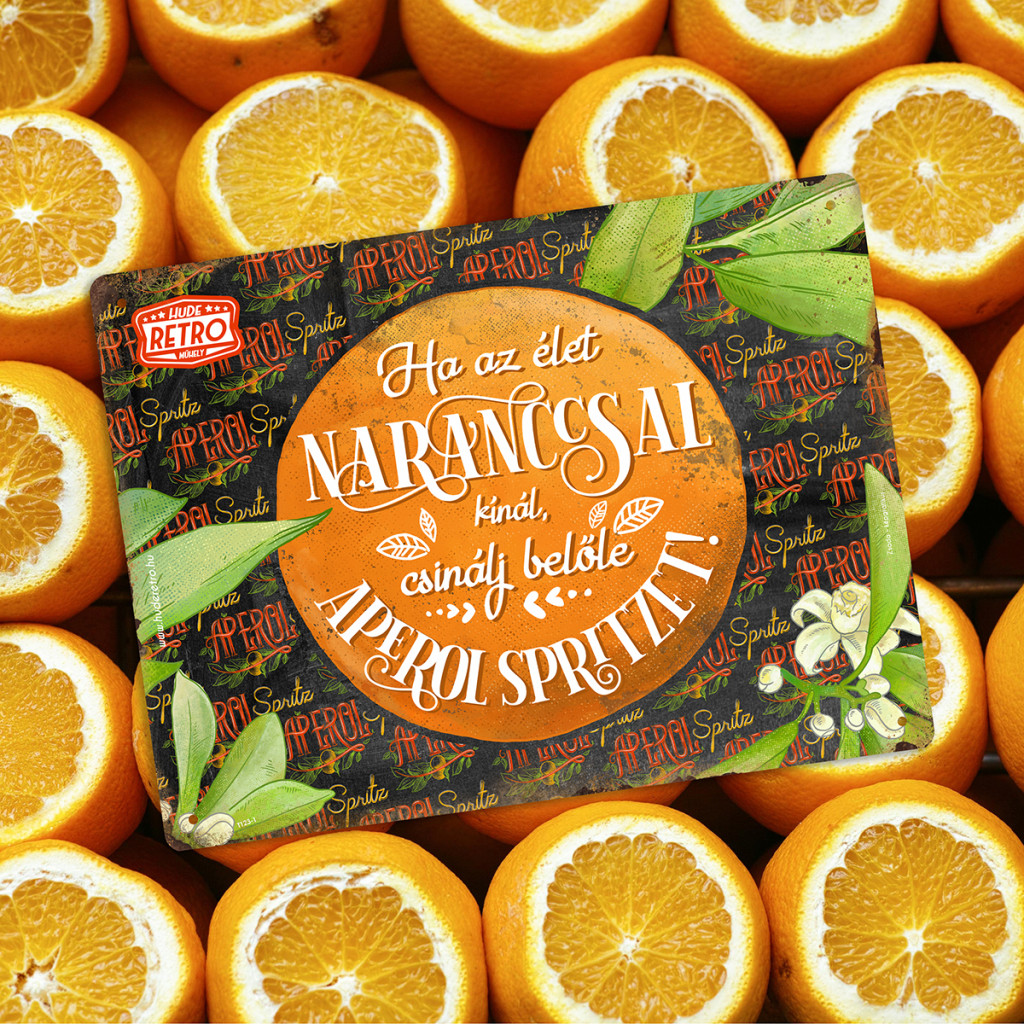 Ez a tábla nem csak egy koktélra utal – hanem egy hozzáállásra. Mert az élet néha csak narancsot dob, de rajtunk múlik, hogy Aperol Spritz lesz-e belőle. Ez a humoros és inspiráló grafika tökéletes választás azoknak, akik könnyedén veszik a dolgokat – és még könnyedebben kortyolnak bele.